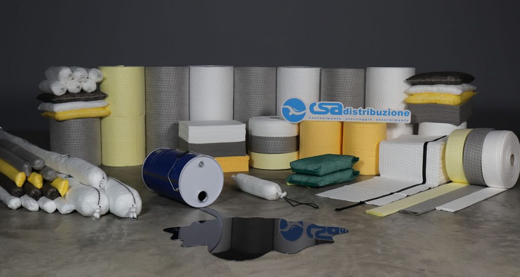 Sono disponibili assorbenti in polvere e granuli, assorbenti per inquinanti in polipropilene e Kit di pronto intervento antinquinamento per assorbire tutti i liquidi