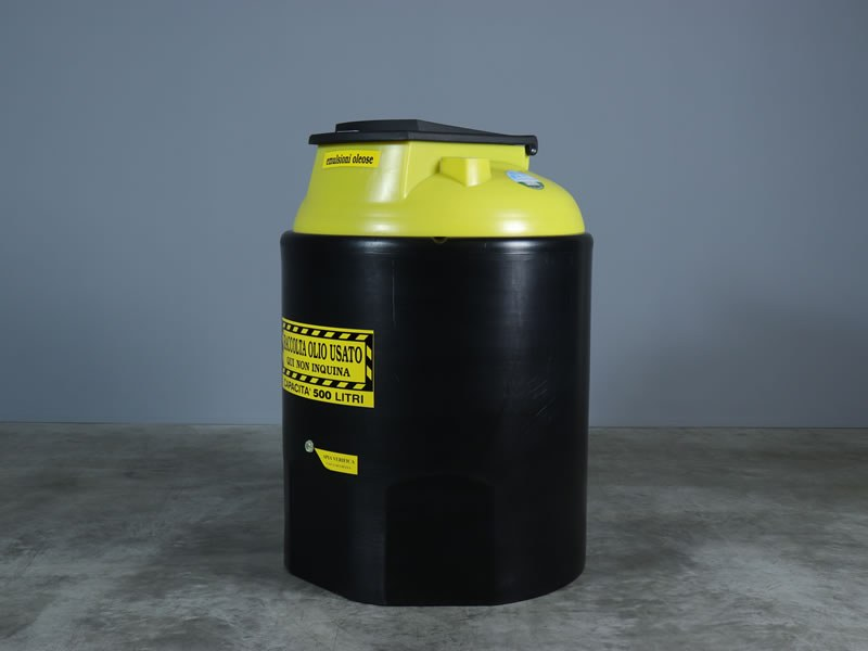 La parte superiore dei contenitori è dotata di un’ampia apertura circolare con coperchio ribaltabile e chiusura di sicurezza. Da essa si immette e si estrae l’inquinante. Tolto il coperchio si presenta un comodo cestello forato che si presta a scolafiltri. Sul corpo esterno del contenitore è posizionato l’indicatore visivo di livello e, più in basso una spia di verifica per monitorare l’intercapedine delle due vasche di contenimento.