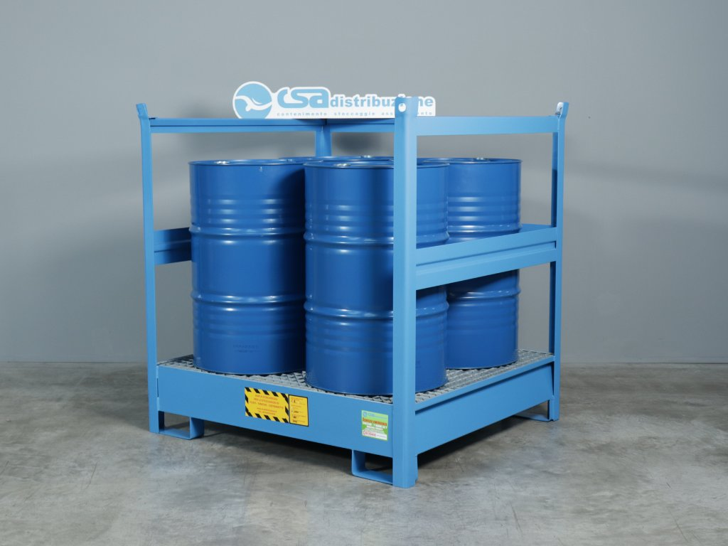 Vasca di contenimento con parapetto per lo stoccaggio di 4 fusti verticali da lt 200 (oppure 2 fusti orizzontali da lt 200 poggiati su 1 portafusti P2F oppure 4 fusti da lt 200 orizzontali poggiati su 2 portafusti P2FS).