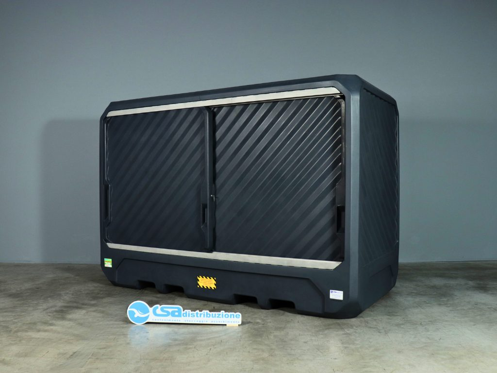 Armadio realizzato in polietilene. Progettato per stoccare liquidi corrosivi e idrocarburi è dotato di apertura a due ante scorrevoli con chiusura a chiave. Tra le pareti e la vasca di contenimento non vi sono saldature in quanto trattasi di struttura monoblocco. La vasca di raccolta possiede una capacità di raccolta pari a 2795 lt.